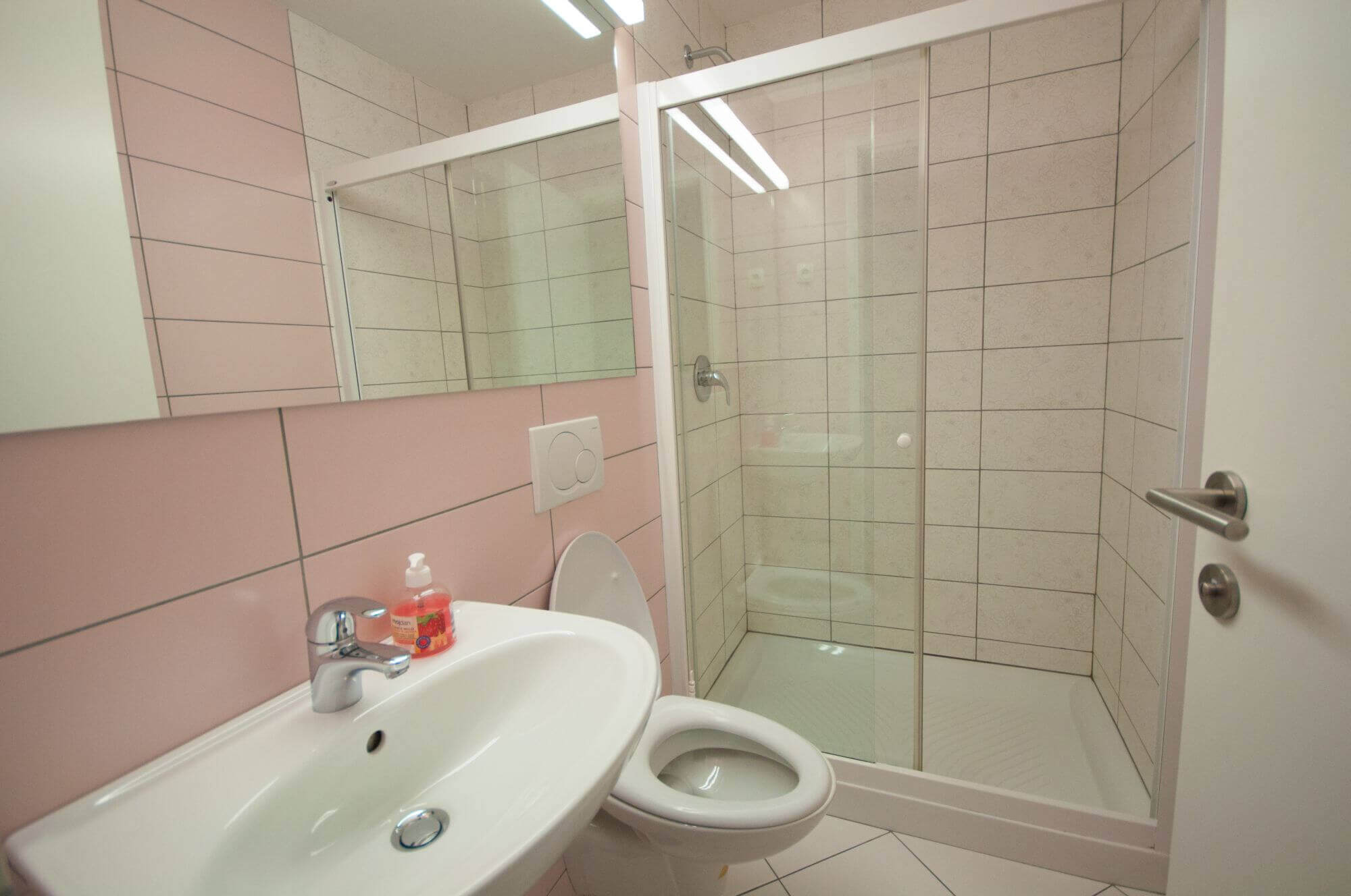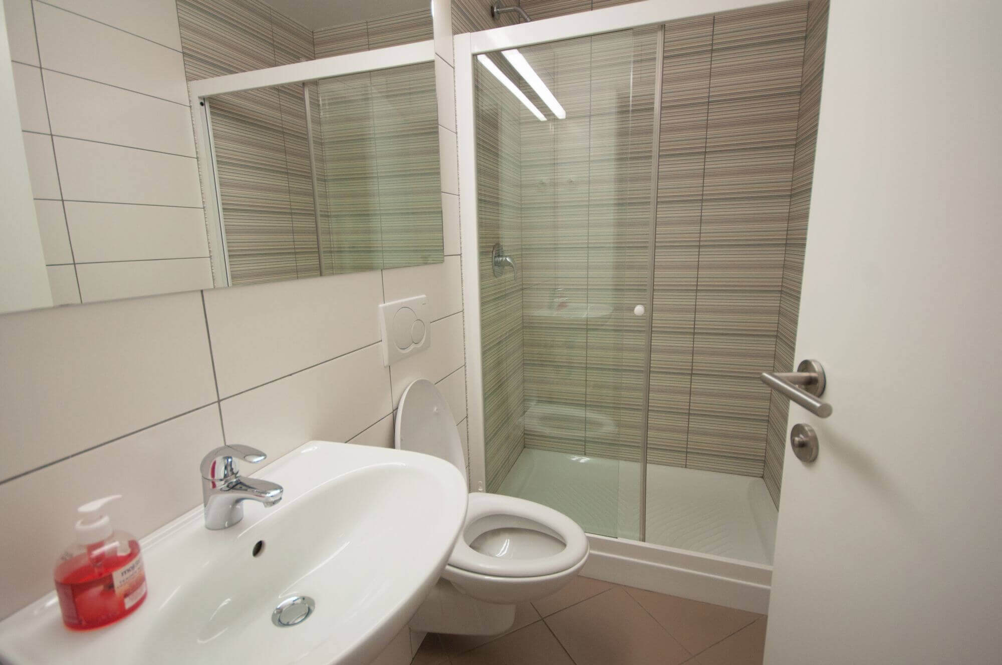 - bathroom with a shower and a toilet,