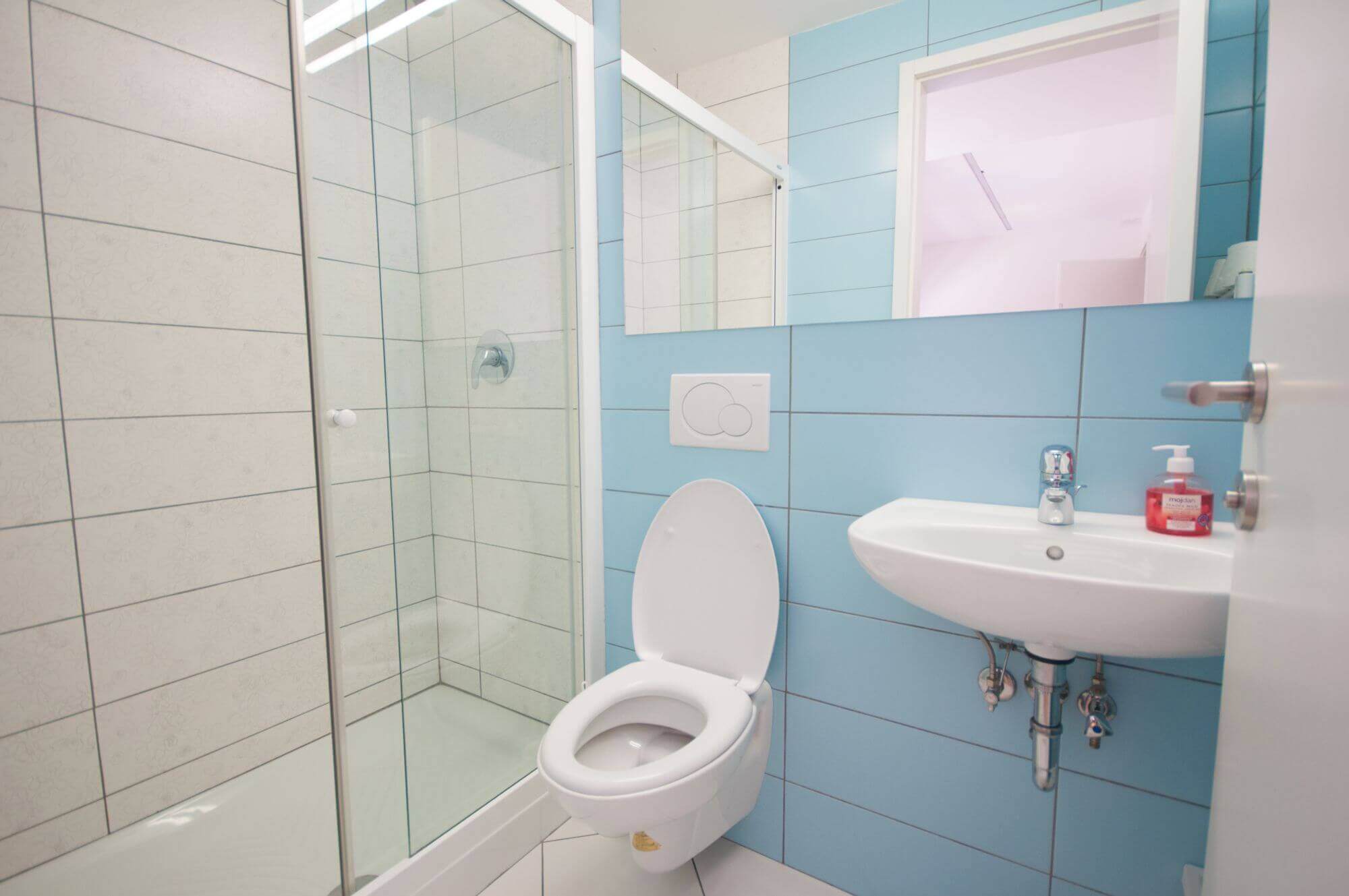 - bathroom with a shower and a toilet,